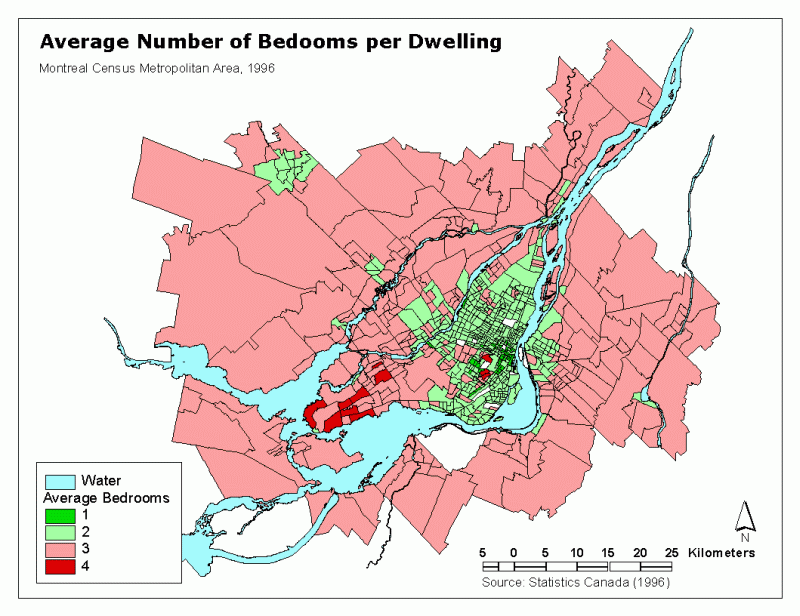 The West Island has the greatest number of bedrooms per household, particularly